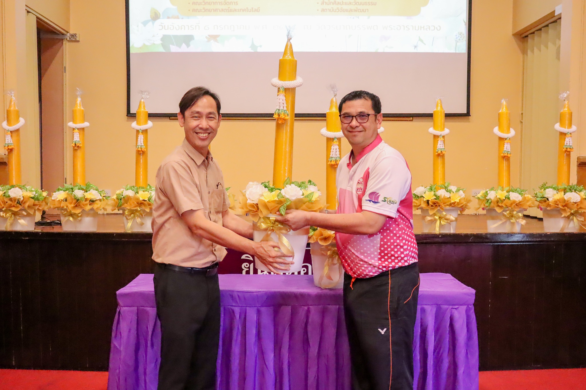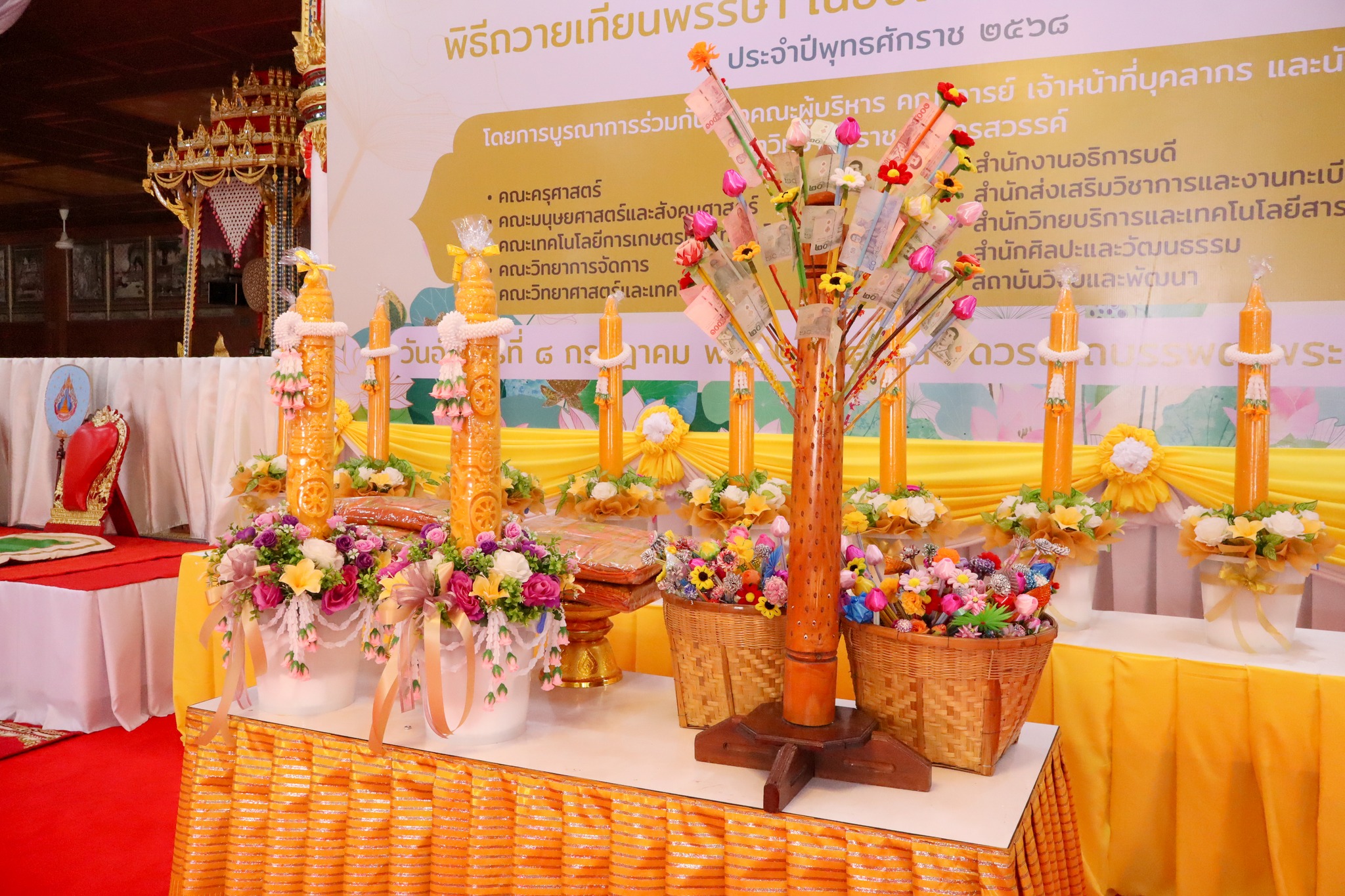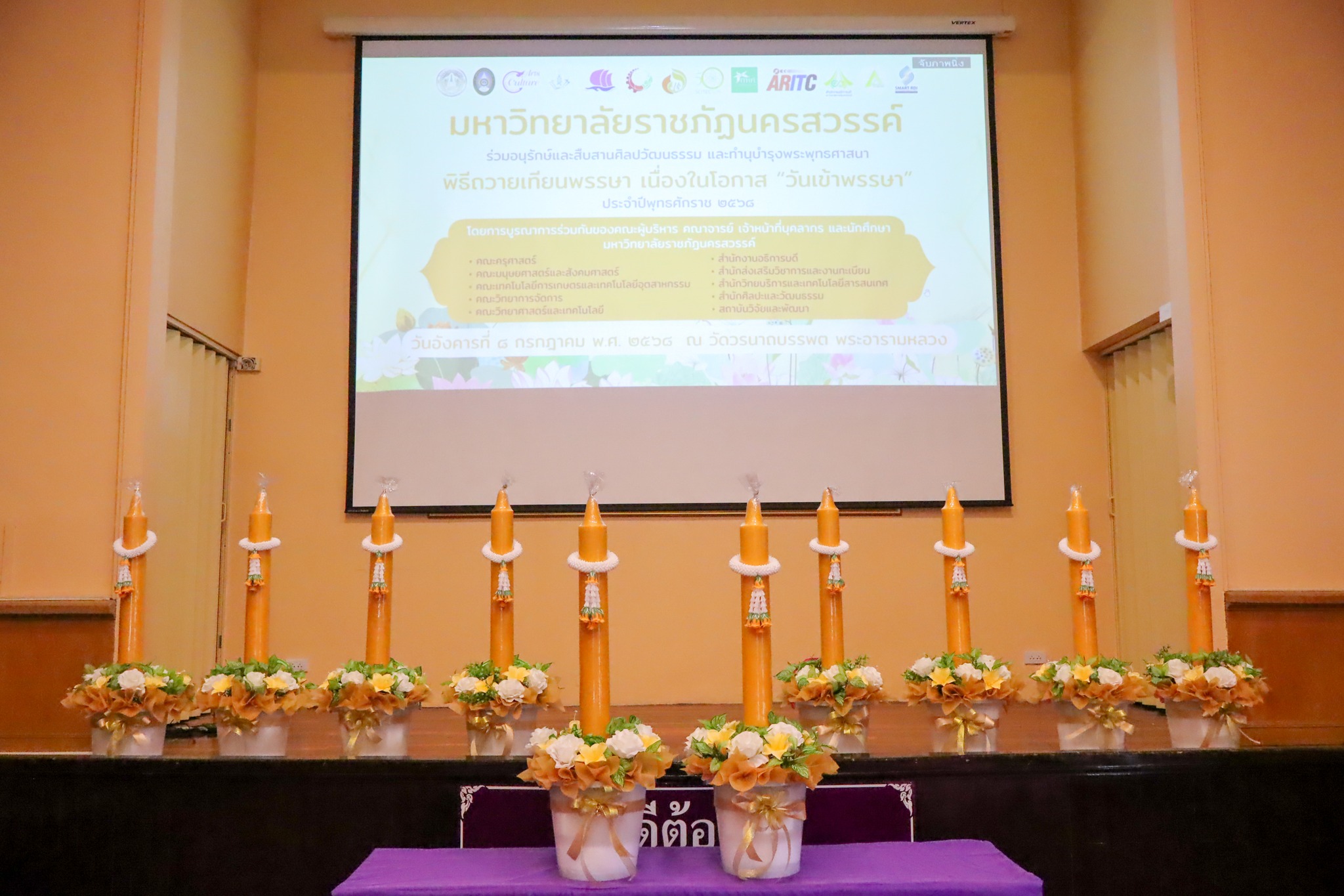 วันที่ 1 กรกฎาคม พ.ศ. 2568 ผู้ช่วยศาสตราจารย์ ดร.มงคล ศัยยกุล ผู้อำนวยการสำนักศิลปะและวัฒนธรรม ได้จัดพิธีมอบเทียนให้กับตัวแทนคณะทั้ง 5 คณะ เพื่อนำไปถวายในพิธีถวายเทียนพรรษา เนื่องในโอกาส “วันเข้าพรรษา” ประจำปีพุทธศักราช 2568